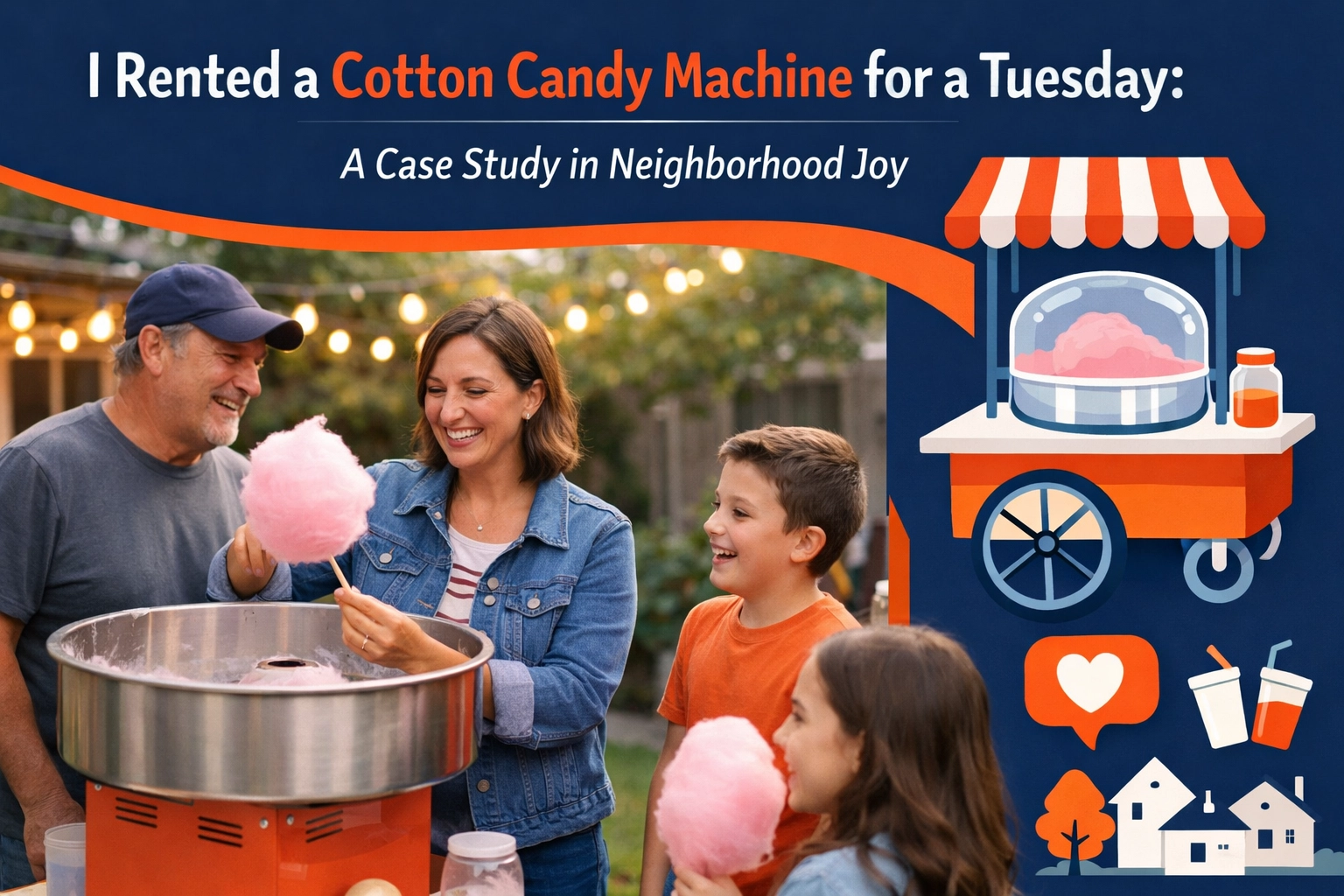 I walked over to Marcus's house, the neighbor I'd waved to approximately 47 times but never actually spoken to beyond "Hey, nice weather!" He greeted me at the door with the cotton candy machine already loaded in its carrying case, along with three different flavors of sugar (apparently, blue raspberry is his personal favorite).